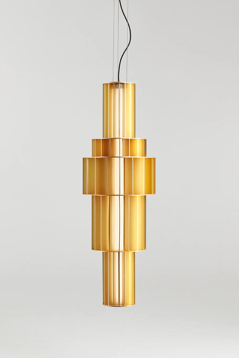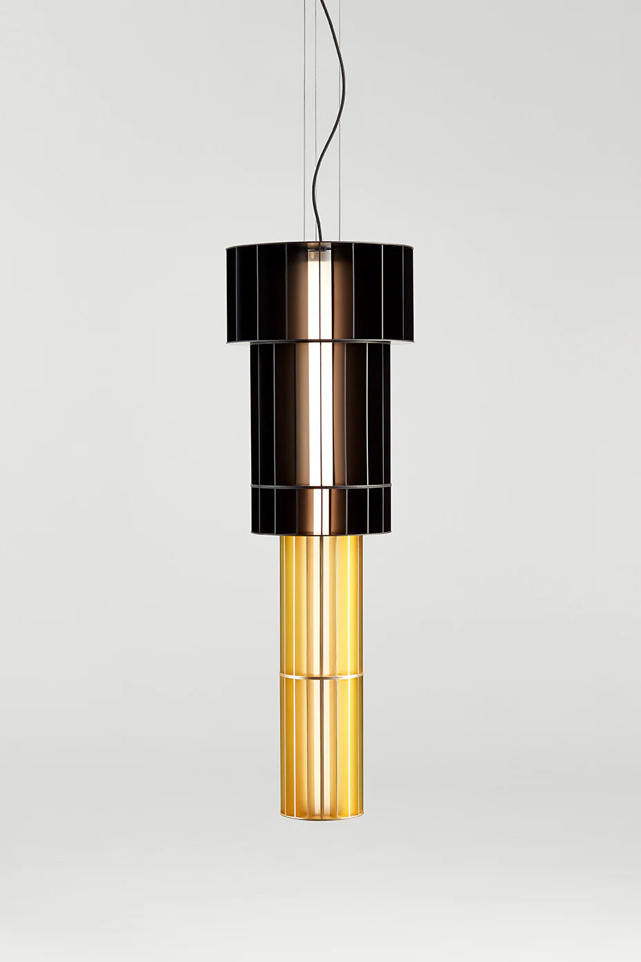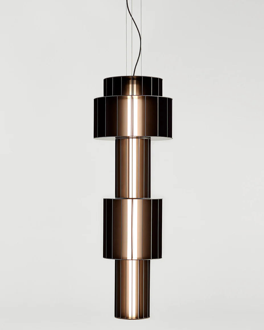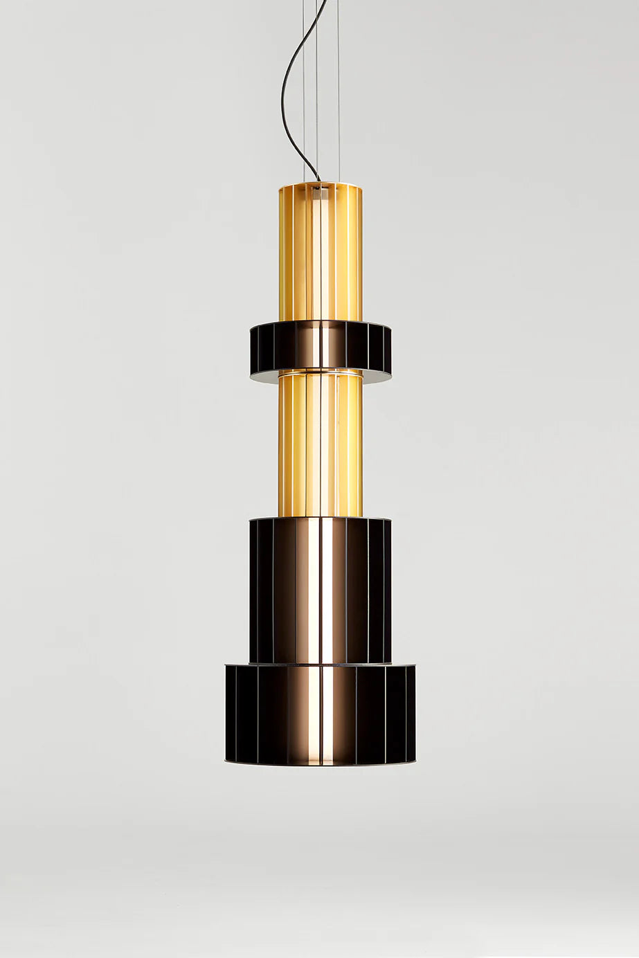 Una luminaria suspendida construida a partir de estructuras de aluminio de distintas alturas y diámetros. La posibilidad de combinar libremente formas y colores permite crear composiciones verticales de carácter escultórico, evocando figuras totémicas de gran impacto visual.