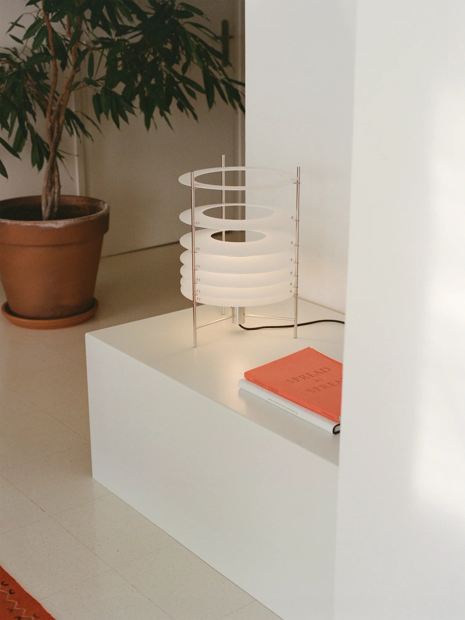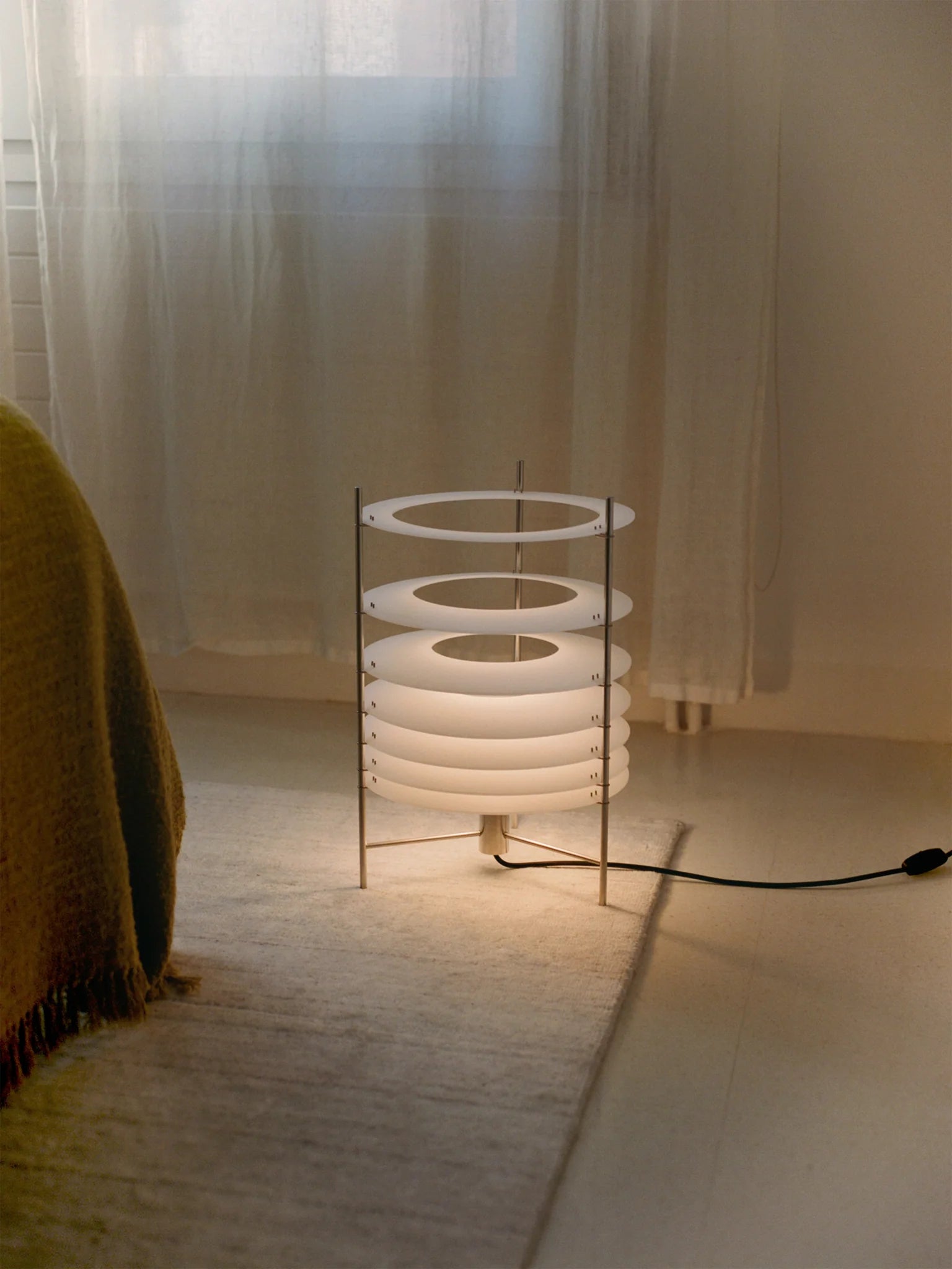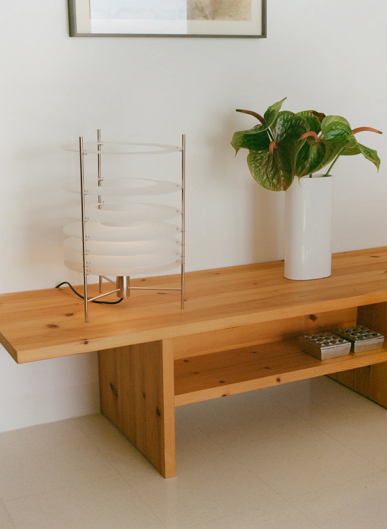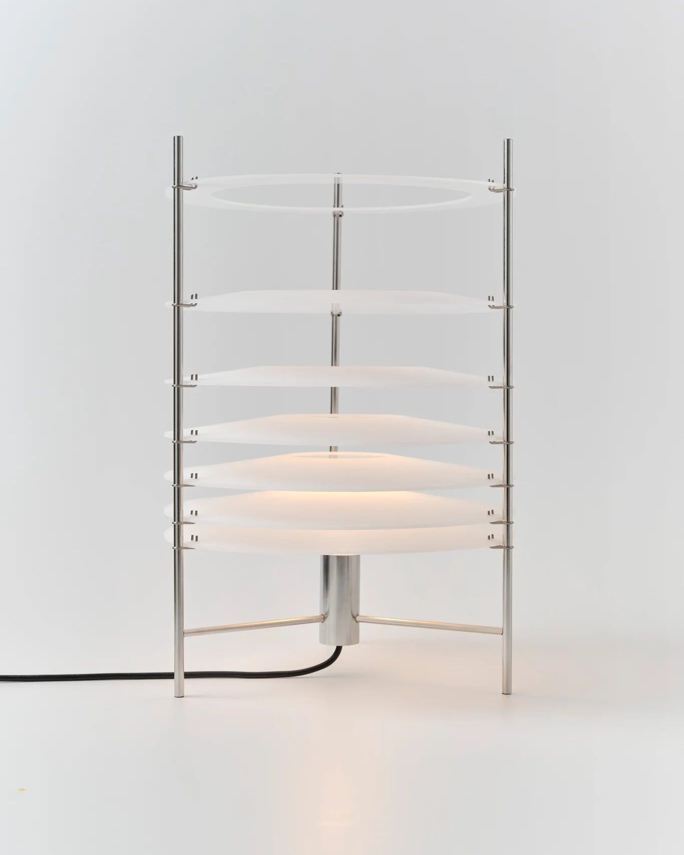 Una luminaria diseñada por Guido Valin que explora el comportamiento y la percepción de la luz en el espacio. TOPURO L nace del concepto de la desmaterialización de la luz, representando cómo esta se desplaza y se atenúa gradualmente a medida que atraviesa el entorno. Para lograr este efecto visual y conceptual, la pieza incorpora una estructura de acero inoxidable acompañada por una serie de discos de acrílico dispuestos de forma progresiva, creando una metáfora visual del desvanecimiento de la luz.