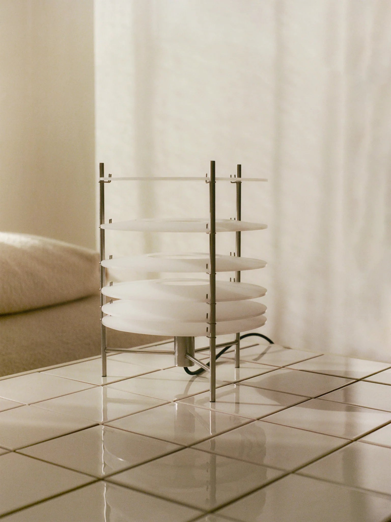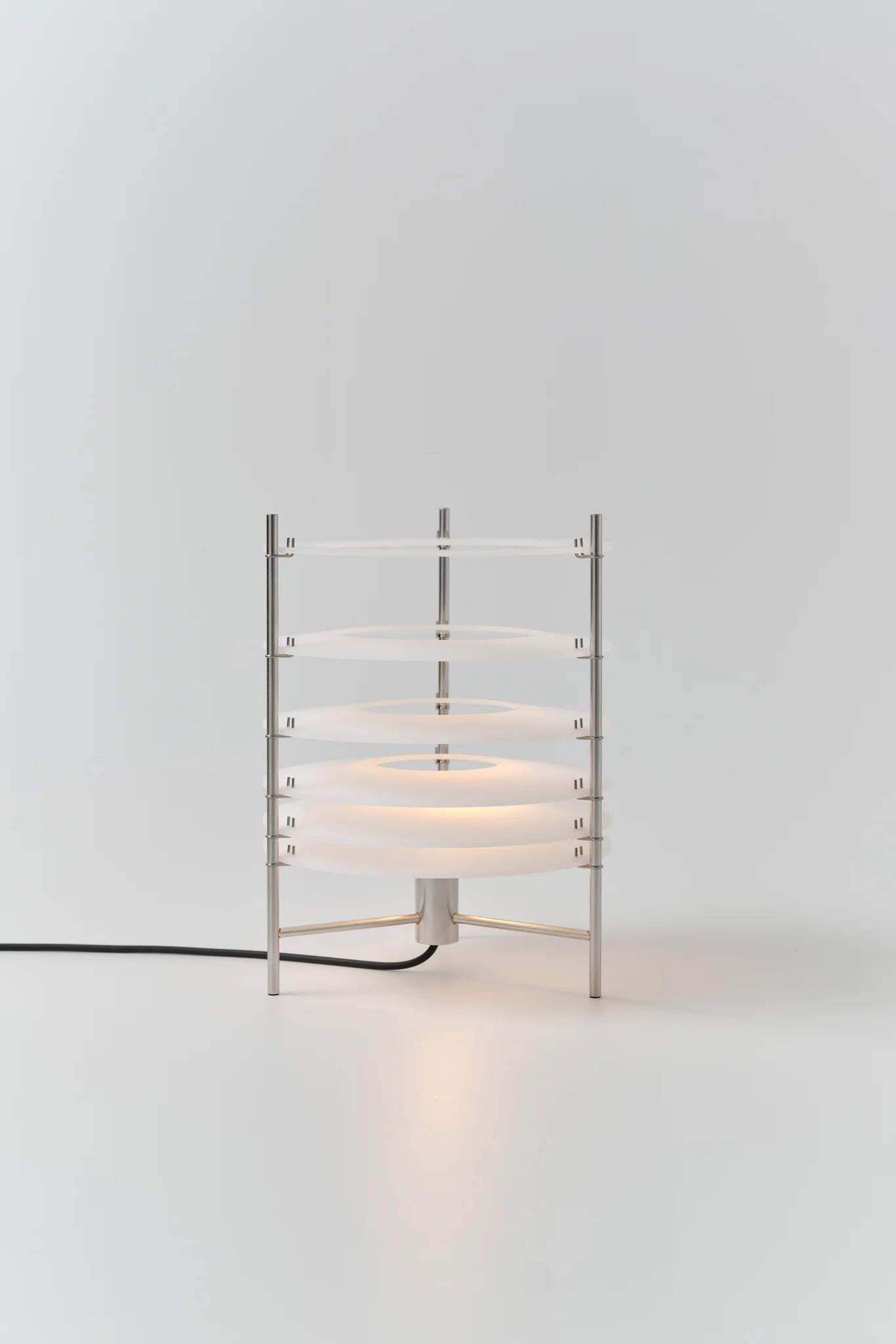 Una luminaria diseñada por Guido Valin que explora la relación entre luz, espacio y percepción. TOPURO S nace del concepto de la desmaterialización de la luz, representando cómo esta se desplaza a través del espacio mientras pierde gradualmente su intensidad. Para expresar esta idea, la lámpara utiliza una estructura de acero inoxidable acompañada por una serie de discos de acrílico dispuestos de manera progresiva, creando una metáfora visual del desvanecimiento de la luz y aportando una estética ligera y contemporánea.
