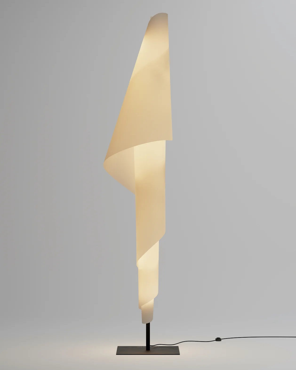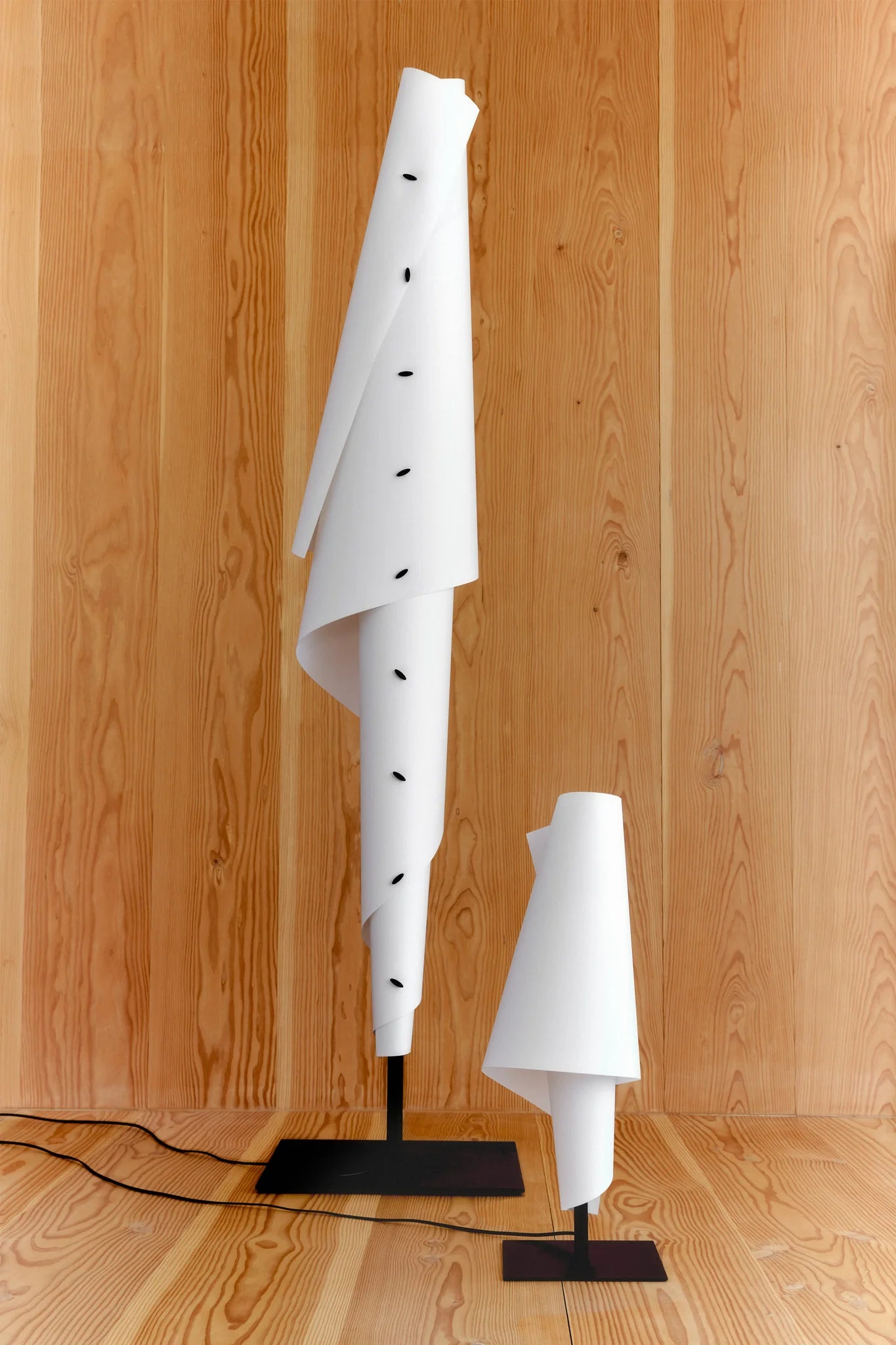 Una luminaria formada por un difusor que envuelve un mástil de acero con acabado negro texturizado. Su forma se mantiene gracias a botones diseñados a medida, delicadamente atornillados en la parte posterior de la lámpara, evocando durante el montaje la meticulosa labor de un sastre. La fuente de luz emite una iluminación cálida y envolvente, con una textura suave que realza su carácter artesanal y sofisticado.