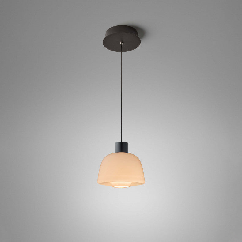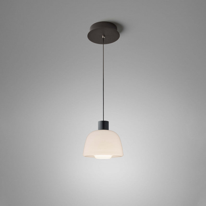Su forma, cuidadosamente diseñada, equilibra delicadeza y precisión, proyectando una iluminación que combina difusidad y dirección con una armonía impecable. La apertura inferior permite que la luz fluya con naturalidad, mientras el sistema matricial compartido con el resto de la familia preserva la coherencia formal y técnica del conjunto.
