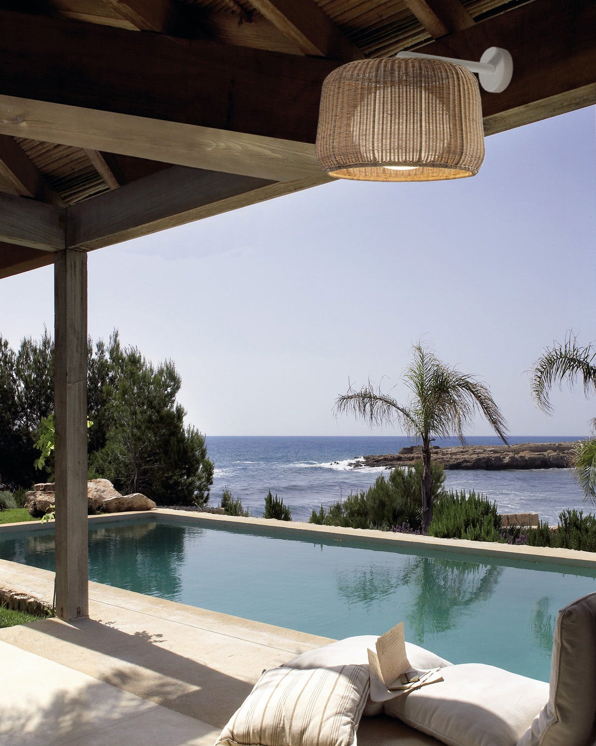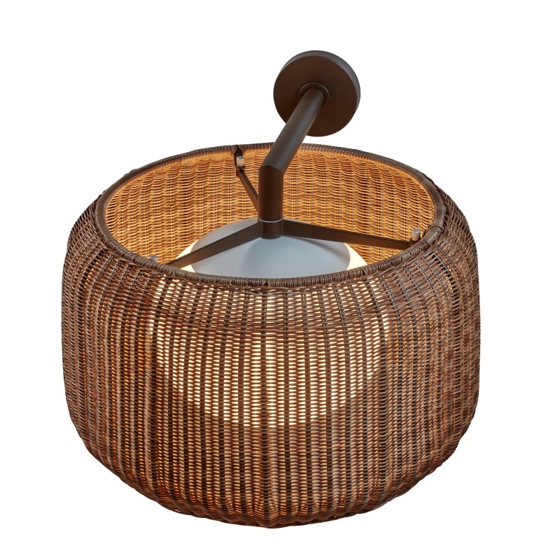 La pantalla de médula sintética, tejida con precisión, filtra la luz y crea una atmósfera envolvente y agradable, evocando la serenidad de los entornos mediterráneos. Esta combinación de tecnología y artesanía da lugar a una luminaria versátil que se adapta tanto a ambientes interiores como exteriores, aportando calidez, textura y equilibrio visual.