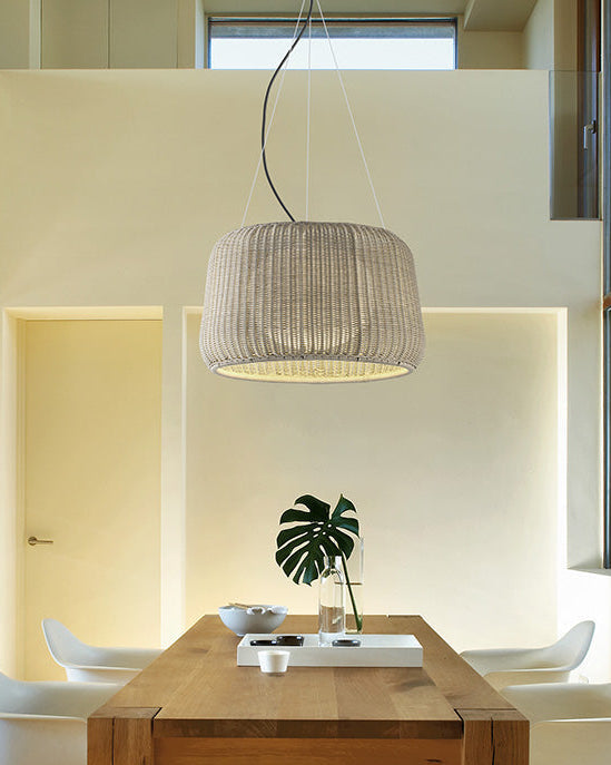 La pantalla de médula sintética, resistente a las inclemencias del tiempo, difunde la luz de manera envolvente, generando atmósferas agradables y confortables. Versátil y adaptable, Fora 90 es perfecta para interiores y exteriores, disponible en múltiples formatos: lámpara de sobremesa, pie, plafón, suspensión doméstica y suspensión de gran tamaño.