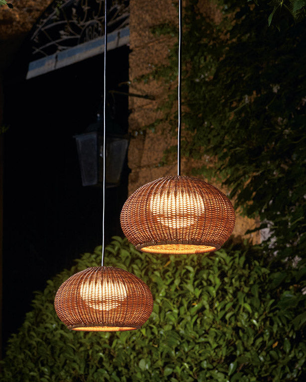 La Garota Hang rinde homenaje a las equinoideas de los fondos marinos, evocando la delicadeza del caparazón de un erizo de mar. Sus formas elípticas, fabricadas en polietileno resistente, protegen las fuentes de luz de la humedad, convirtiéndola en una pieza ideal para espacios interiores y exteriores.