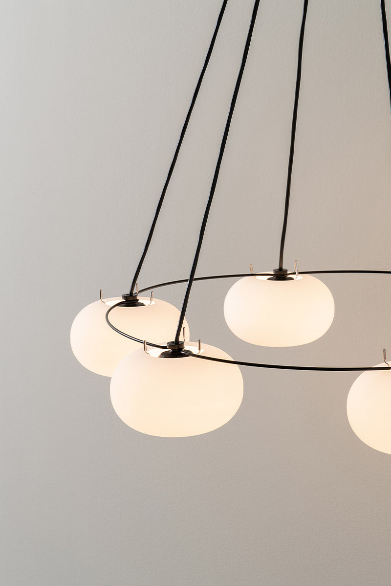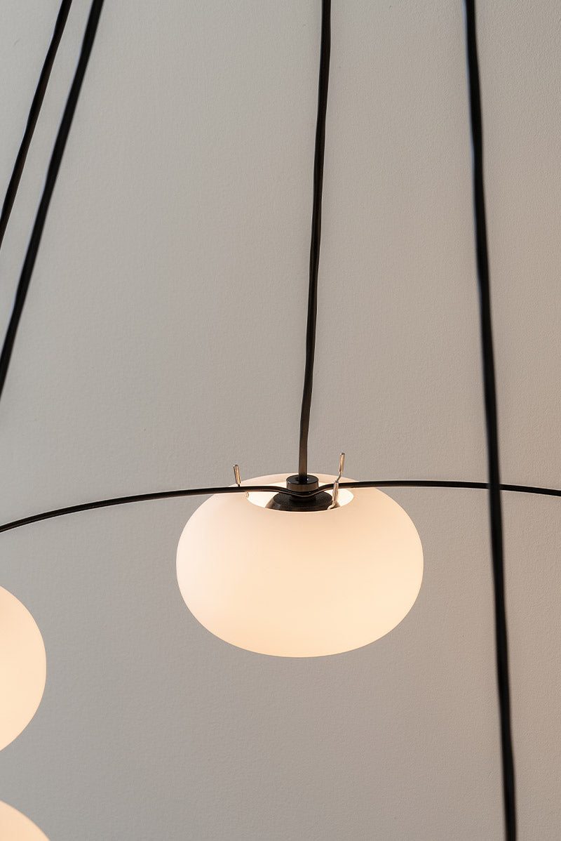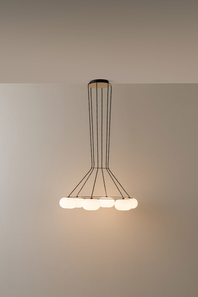 Su globo de vidrio soplado emite una luz cálida y envolvente, perfecta para generar ambientes acogedores. La base reversible de madera de fresno ofrece dos acabados —lacado en negro por un lado y natural por el otro— para adaptarse a diferentes estilos. Además, su sistema de muelles en la base facilita un montaje rápido y ágil, añadiendo practicidad a su diseño elegante.