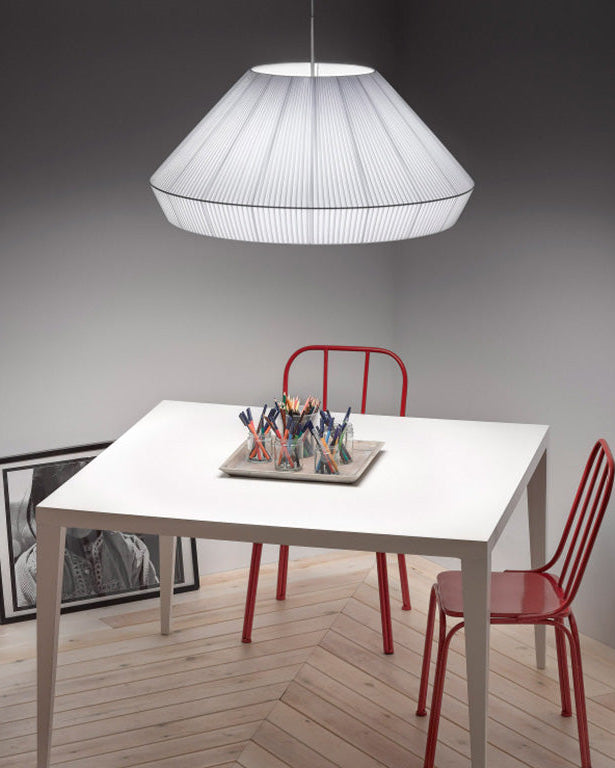 La colección Mei constituye una familia de lámparas de suspensión que combina diferentes líneas y formatos bajo un mismo sello distintivo: la cinta. Cada pantalla es elaborada de forma artesanal en las instalaciones de BOVER, desde la soldadura de los armazones de gran formato hasta el minucioso proceso de encintado. Este control integral permite garantizar la máxima calidad, personalización y precisión en los plazos de entrega.