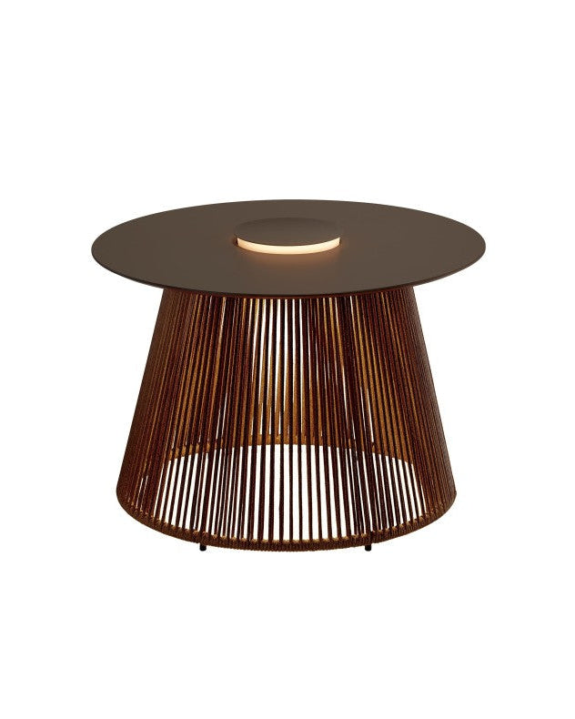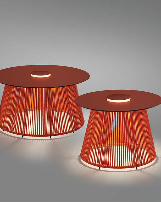 Su superficie circular parece flotar sobre una estructura metálica trenzada, evocando la armonía entre diseño y utilidad. La luz, discreta pero precisa, se filtra desde el interior de su falda iluminada, ofreciendo el resplandor justo para desenvolverse alrededor sin invadir el entorno.