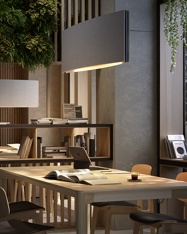 El diseño de Noren responde a las necesidades de entornos colectivos y de trabajo, ofreciendo iluminación de calidad y reduciendo el ruido ambiental mediante un elemento decorativo funcional y elegante. BOVER presenta esta colección en tres acabados estándar, con la opción de elegir otros colores de la paleta de tejidos Moss de Crevin para pedidos de cinco unidades o más.