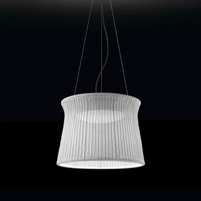 La Syra 60 Outdoor destaca por su elegancia artesanal y resistencia técnica, combinando estética y funcionalidad en una luminaria de suspensión versátil. Su pantalla, tejida con fibra sintética sobre una estructura de aluminio, envuelve la luz con calidez y textura, mientras un plafón de cristal opalino difumina la iluminación para crear una atmósfera acogedora.