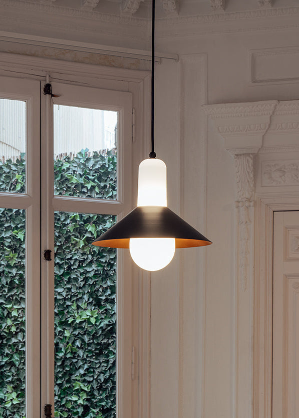 La pantalla estampada en acero alberga una esfera de vidrio opal, proyectando una luz amable y envolvente. Combinada con sus acabados en gris marengo y cobre metalizado, Tagomago se adapta fácilmente a espacios abiertos o cerrados, ofreciendo versatilidad y elegancia en cualquier ambiente.