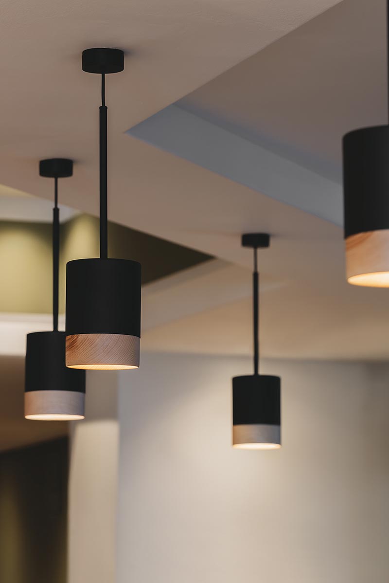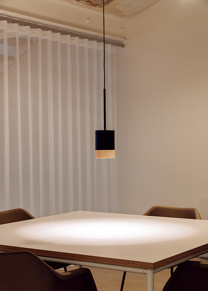 La base de fijación al techo, en acero lacado negro mate, mantiene la coherencia estética del diseño. Su sobriedad, unida a la tensión visual generada por el contraste entre materiales, convierte a Third en una pieza especialmente atractiva para arquitectos e interioristas que buscan un equilibrio entre carácter, funcionalidad y refinamiento.