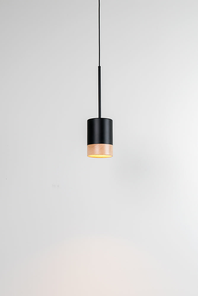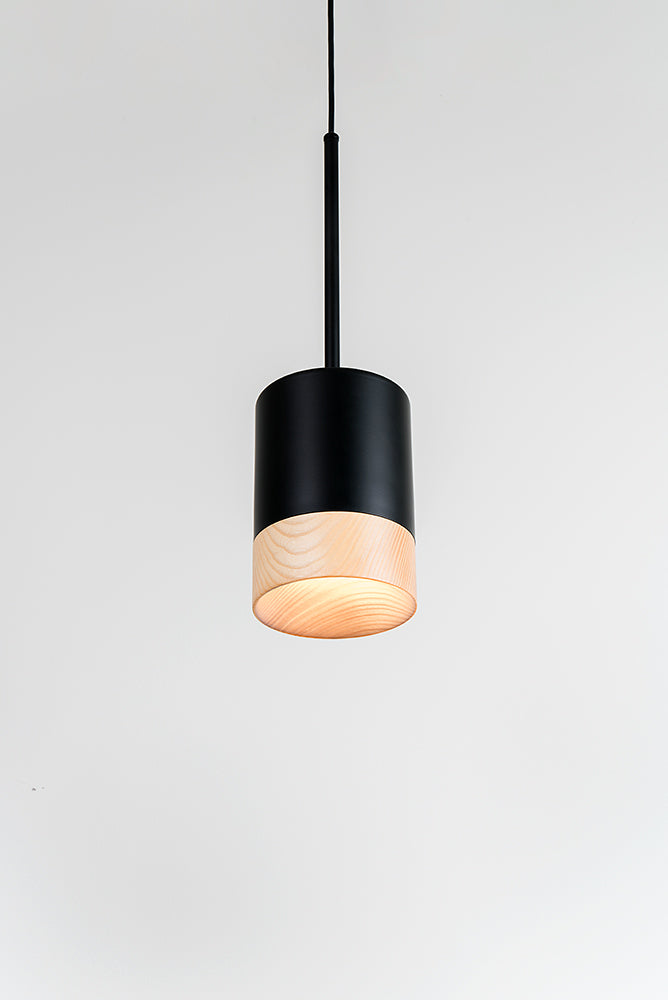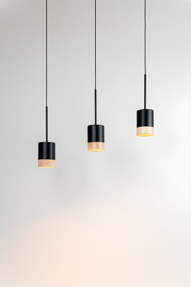 Third divide su estructura en tres secciones iguales, donde dos conforman el cabezal en acero lacado estampado y la tercera corresponde a una pantalla difusora de fresno barnizado. Esta composición geométrica da lugar a una lámpara de suspensión con una luz focalizada que proyecta un halo sutil, perfecto para crear atmósferas elegantes y precisas.