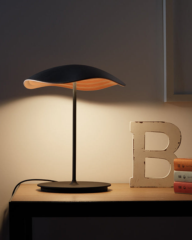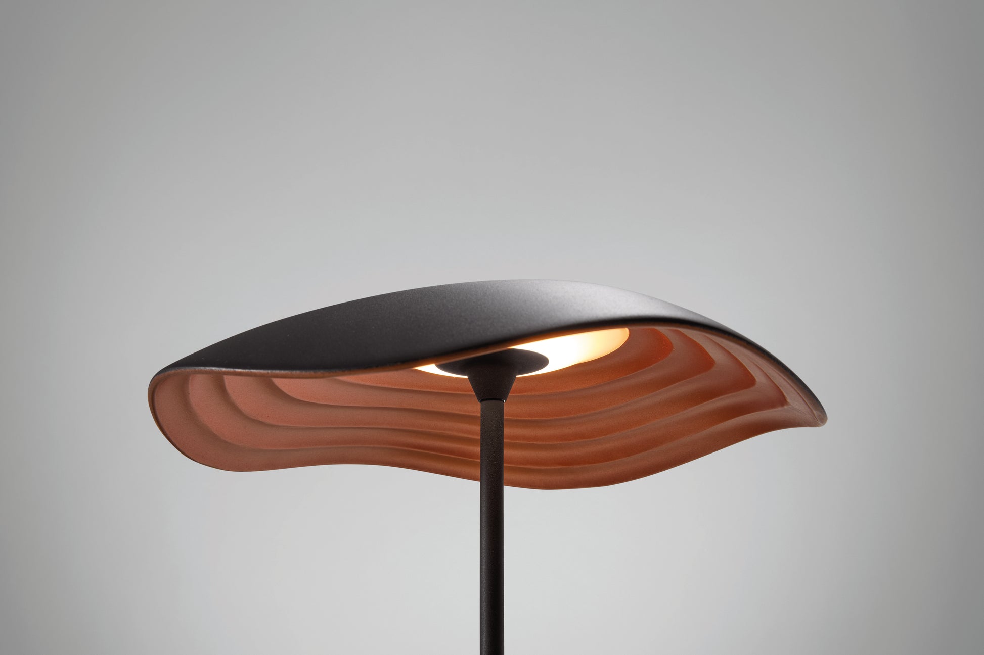 Su luz se proyecta de forma directa hacia abajo a través de un pequeño difusor de policarbonato, ofreciendo funcionalidad sin perder calidez. El acabado exterior es mate y disponible en colores versátiles —gris oliva, gris claro, terracota y negro—, mientras que el interior mantiene un tono blanco suave, excepto en la versión negra, que combina con un acabado cobrizo interior para un detalle distintivo y sofisticado.